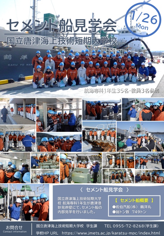 1月26日に佐伯汽船(株)のセメント船「鶴洋丸」見学会が行われ、国立唐津海上技術短期大学校1年生35名が船内を見学しました。学生にとっては、初めてのセメント船の見学であり、大変貴重な見学会となりました。この場を設けていただきました佐伯汽船(株)を始め、鶴洋丸乗組員の皆さま、ご協力ありがとうございました。