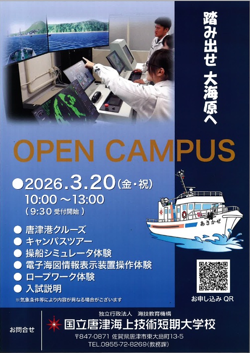 以下の日程でオープンキャンパスを開催します。この機会に操船シミュレータやECDIS(電子海図情報表示装置)の操作に挑戦して、ぜひ、唐津の地から航海士や船長をめざしてみませんか。