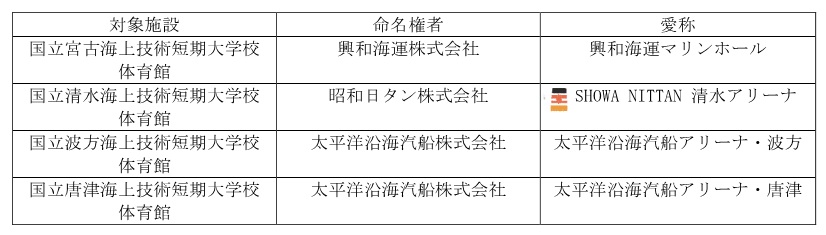 このたび、第2弾となる海上技術短期大学校4校(宮古校、清水校、波方校、唐津校)の体育館における命名権者及び愛称が決定いたしました。