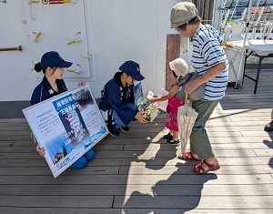 厳しい財政状況の中で、船員教育機関としてより社会に貢献するために、また優秀な船員を引き続き養成していくために、広く皆様からの募金をお願いしております。募金は各寄港地で実施する練習船 一般公開の甲板上で行います。