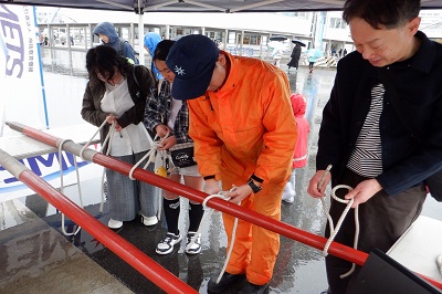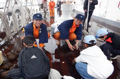 日本丸を見学するために訪れた方は2日間で計2,946名に上り、木甲板の汚れを椰子の殻で擦って落とす椰子摺りや、船舶の運用で使用するロープワークを体験しました。