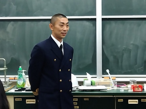 生徒は説明を聞き、今まで触れたことのない海や船に関する話に大いに興味を持ち、質疑応答では、「仕事をしていてどのようなことにやりがいを感じましたか」や「航海士の経験を踏まえて、これから社会に出て行く私たちにアドバイスはありますか」などの質問がありました。