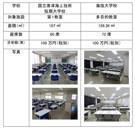 JMETSでは、海技大学校講堂(体育館)、海上技術短期大学校4校の体育館、大型練習船4隻の第一教室に続く、ネーミングライツ事業第4弾として、海上技術短期大学校及び海技大学校の教室の命名権者を募集します。