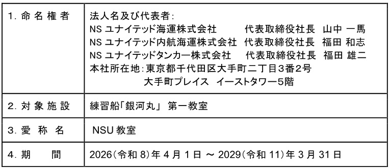 このたび、JMETSネーミングライツ事業第3弾として、大型練習船4隻の第一教室に関する命名権者及び愛称が決定しました。そのうち、練習船「銀河丸」第一教室について、NSユナイテッドグループ(NSユナイテッド海運、NSユナイテッド内航海運、NSユナイテッドタンカー)が命名権者に決定したことを受け、ネーミングライツ契約調印式を下記の通り実施しますので、お知らせいたします。