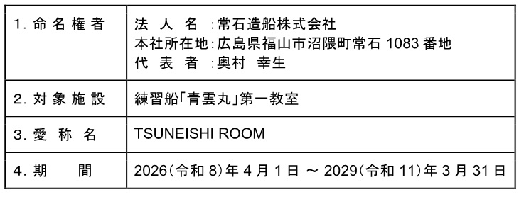 このたび、JMETSネーミングライツ事業第3弾として、大型練習船4隻の第一教室に関する命名権者及び愛称が決定しました。そのうち、練習船「青雲丸」第一教室について、常石造船株式会社が命名権者に決定したことを受け、ネーミングライツ契約調印式を下記の通り実施しますので、お知らせいたします。