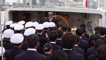 出航に際して行われた出航式では、来賓の国土交通省新垣海事局長から「皆さんには船員としての役割を担う一員としての期待が寄せられています。充実した訓練となることを期待しています。」と訓示をいただきました。JMETS佐々理事長から「船舶運航技術だけでなく、海と慣れ親しむ力や、長い航海を団結して乗り切る力を身につけていただきたい。」と激励の言葉をいただきました。出港時には、保護者や見送りに訪れた皆様に感謝の意を込めて登檣礼(とうしょうれい)を行い、力強く航海の第一歩を踏み出しました。