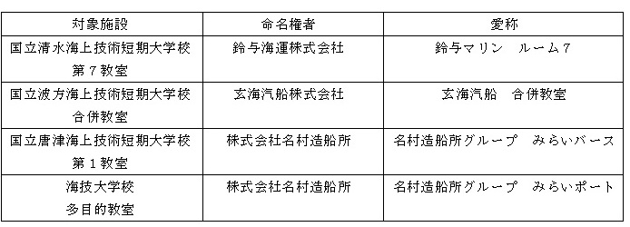 独立行政法人海技教育機構(JMETS)は、船員教育及び航海訓練環境の向上を目的に進めているネーミングライツ事業の第4弾として、海上技術短期大学校3校(清水校、波方校、唐津校)及び海技大学校の教室の命名権者と愛称を決定いたしました。